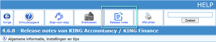 De release notes van KING Accountancy / KING Finance zijn verplaatst naar de Help van KING Accountancy / KING Finance . Toets [F1] in KA/KF om de Help te openen. Op iedere pagina in de help zijn de release notes bereikbaar. Klik daartoe op de knop [Release notes].